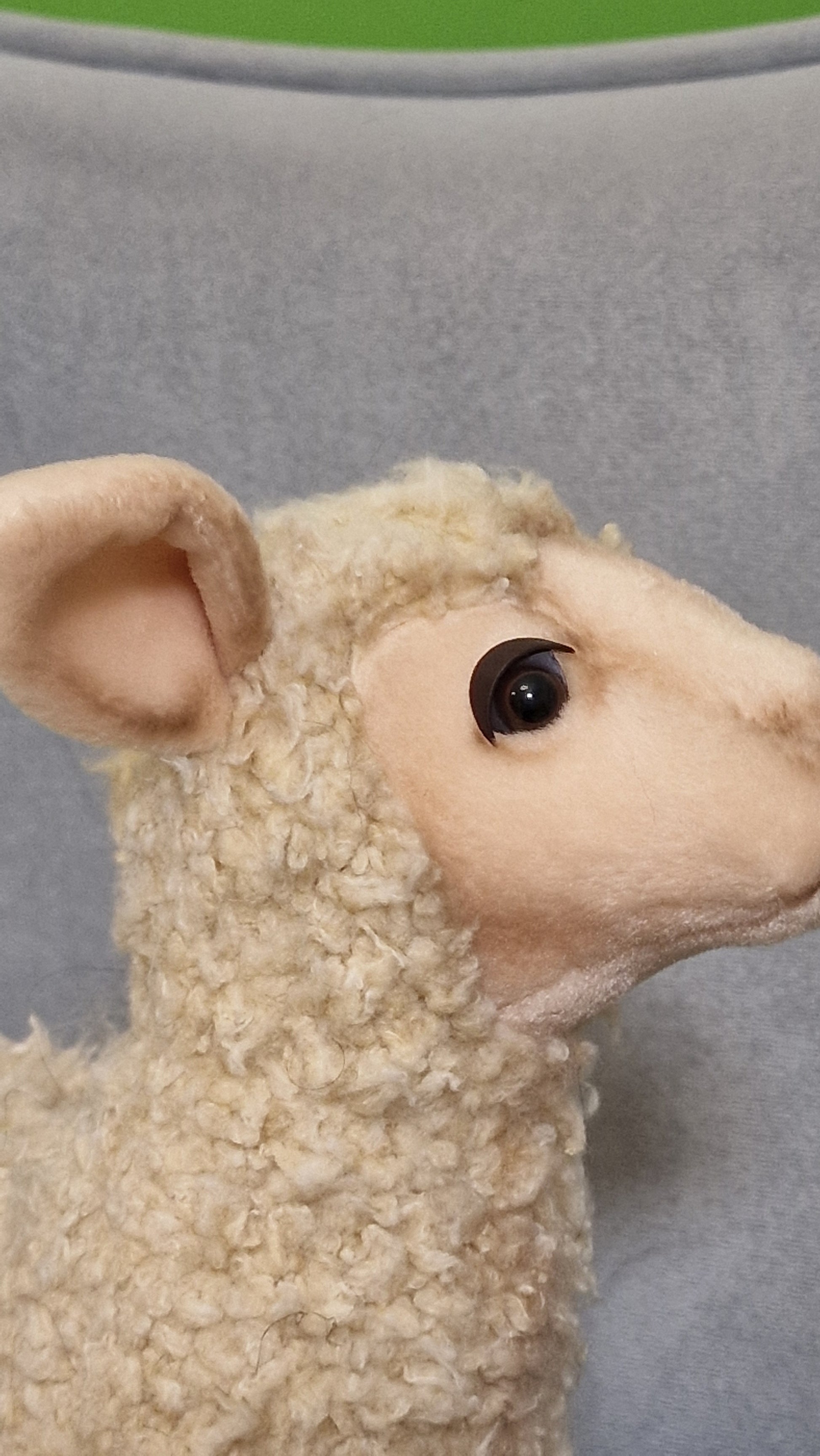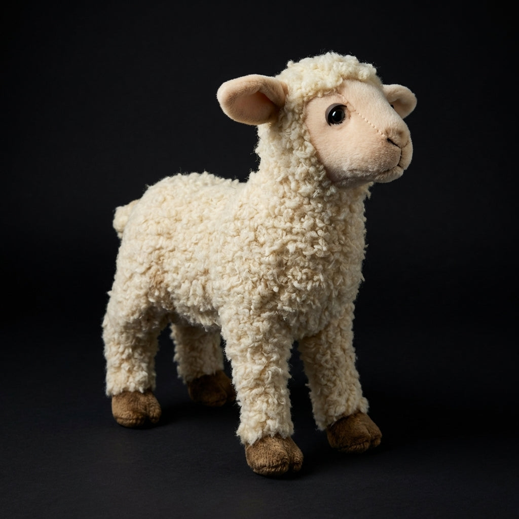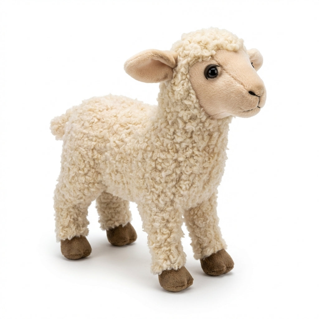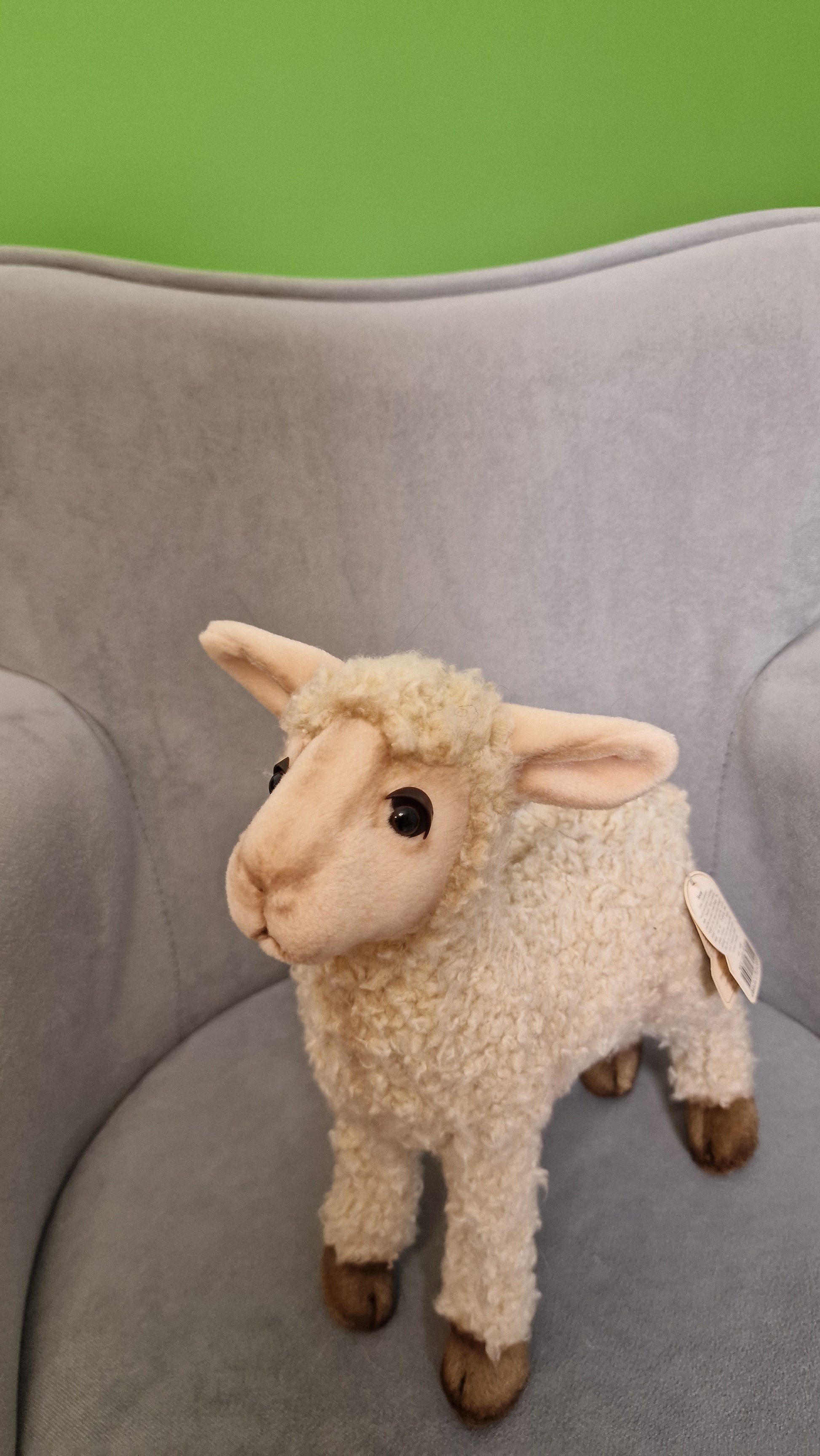 Mięciutki, kremowy baranek o delikatnym, kręconym runie – tak realistyczny, że aż chce się go przytulic. Spokojny wyraz pyszczka i staranne wykonanie sprawiają, że to jeden z tych prezentów, które zostają w sercu na długo.
